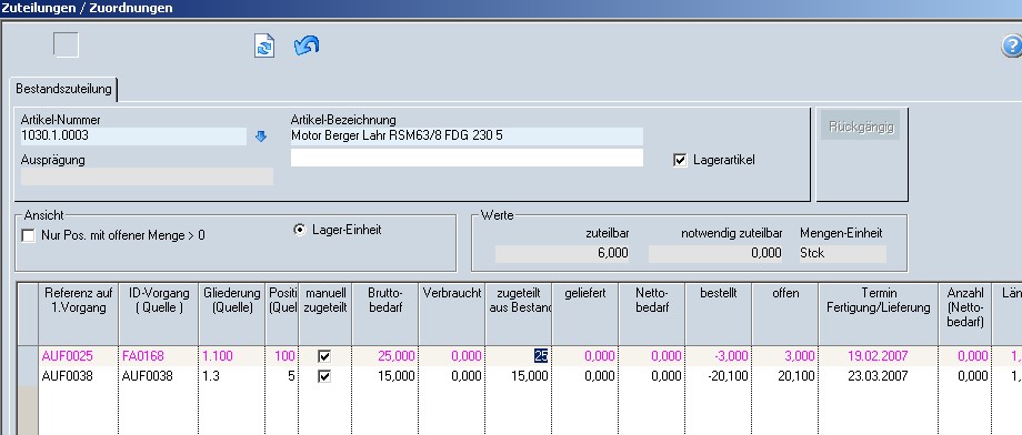 Wird in die Spalte "Zugeteilt aus Bestand" eine andere als die automatisch zugeteilte Menge geschrieben und gespeichert, gilt diese Menge als zugeteilt und das Optionsfeld "manuell zugeteilt" wird aktiviert. Dies hat zur Konsequenz, dass beim nächsten automatischen Dispositionslauf diese Zuteilung nicht wieder gelöscht und die Menge nicht neu zugeteilt wird, d.h. diese Menge bleibt zu dieser Bedarfsposition fest zugeteilt.
