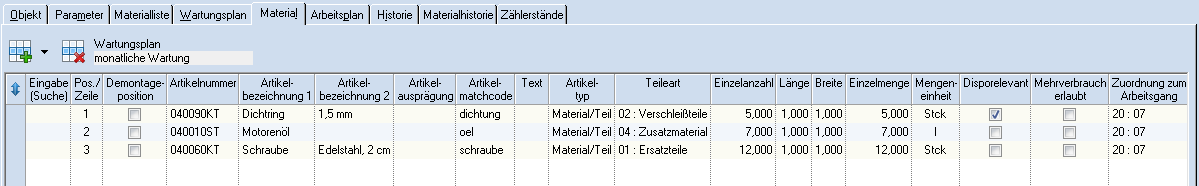 Auf der Registerkarte "Material" werden für den in der Registerkarte "Wartungsplan" markierten Wartungsplan benötigte Ersatzteile und Materialien festgelegt.