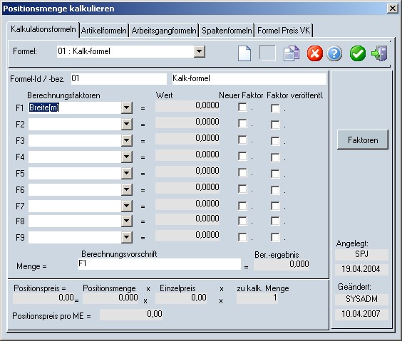 In dieses Feld wird die (mathematische) Berechnungsvorschrift zur Ermittlung der Menge eingetragen. Dabei können die 9 Berechnungsfaktoren verwendet werden (F1, .., F9) sowie Zahlenwerte. Die Faktoren müssen durch mathematische Operationen miteinander verknüpft werden. Dabei sind alle gängigen Operationen bis hin zu Potenzfunktionen und trigonometrischen Berechnungen möglich. Bei der Berechnung der Menge wird die Berechnungsvorschrift geprüft. Wenn ungültige Zeichen festgestellt werden, wird das Berechnungsergebnis stets Null sein.