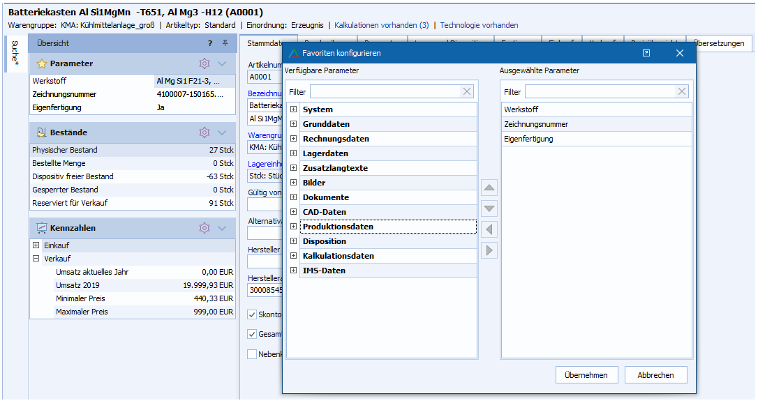 Hinweise: Die Kennzeichnung der Favoriten wird nutzerbezogen gespeichert. Die Parametergruppe "Favoriten" wird nur dann angezeigt, wenn Favoriten definiert wurden.
