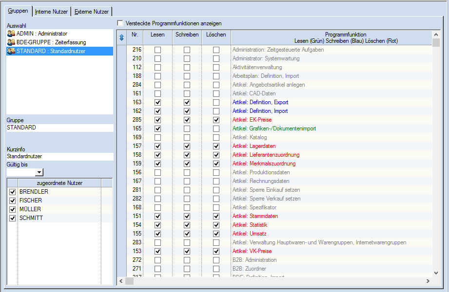 Jeder Gruppe können anschließend durch Aktivierung der Auswahlfelder "Lesen", "Schreiben" und "Löschen" verschiedenen Rechte zugeordnet werden.