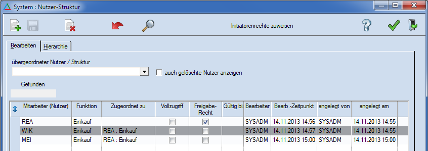 Zum Bearbeiten der Nutzerstruktur stehen nur die internen Nutzer zur Verfügung. Diese müssen zunächst in der Nutzerliste für die erweiterten Zugriffsrechte erfasst werden.