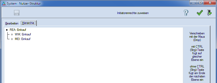 Auf der Registerkarte "Hierarchie" wird die Nutzerhierarchie komplett angezeigt und kann per Drag&Drop geändert werden.