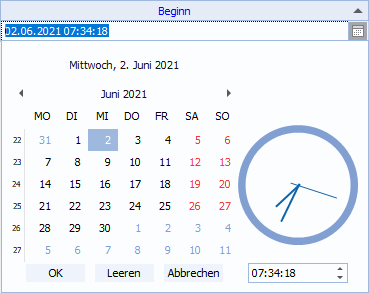 Zusätzlich zur Datumsauswahl gibt es die Datumsauswahl mit Uhrzeit. Neben einem Datum kann hier auch eine konkrete Uhrzeit für den Termin festgelegt werden. Die gewünschte Uhrzeit wird über die Pfeilsymbole am rechten Ende des Feldes ausgewählt oder direkt im Feld eingegeben. Anschließend muss die Auswahl von Datum und Uhrzeit über mit der Schaltfläche "OK" bestätigt werden.