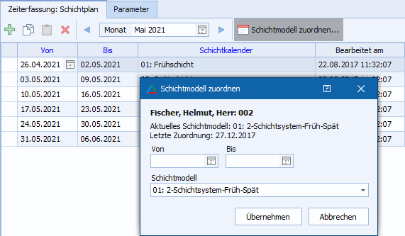 Abb.: Dialog "Schichtmodell zuordnen" im Modul "Personal"
