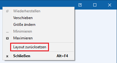 Einige Dialoge können durch ziehen mit der Maus an den Rändern oder Ecken beliebig oder über die Schaltfläche "Maximieren" in der Titelleiste auf die komplette Bildschirmgröße vergrößert werden. Die Anpassung der Dialoggröße wird dabei im Layout des Nutzers gespeichert. Zudem steht für diese Dialoge die Funktion "Layout zurücksetzen" im Kontextmenü der Titelleiste zur Verfügung. Darüber kann die ursprüngliche Größe des Dialogs wiederhergestellt werden.