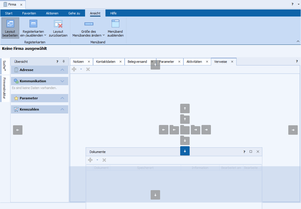 Achtung: Das Ändern des Layouts müssen Sie zunächst im Menüband auf der Registerkarte "Ansicht" über die Schaltfläche "Layout bearbeiten" aktivieren. Erst dann können Sie die Anordnung der einzelnen Registerkarten und Fenster ändern. Im Anschluss sollte die Funktion "Layout bearbeiten" über die gleiche Schaltfläche wieder deaktiviert werden, um versehentlichen Layoutänderungen vorzubeugen.