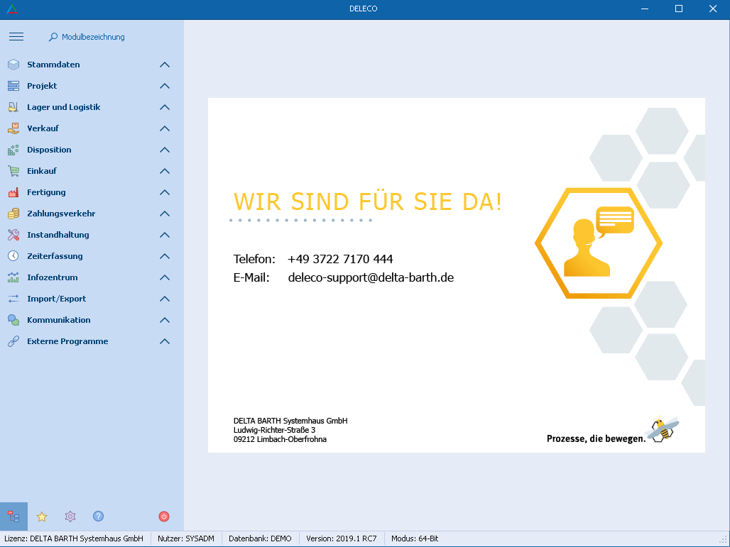 Nach der Anmeldung an der Datenbank erscheint das Startfenster von DELECO. Es besteht aus der Modulnavigation und dem Fensterbereich, in dem die Modulmaske des jeweils geöffneten Moduls angezeigt wird. Im unteren Bereich des Fensters befindet sich die Statuszeile. Diese zeigt die Lizenz, den Benutzername des angemeldeten Nutzers, den Name der Datenbank, die aktuell verwendete DELECO Version sowie den Modus an.