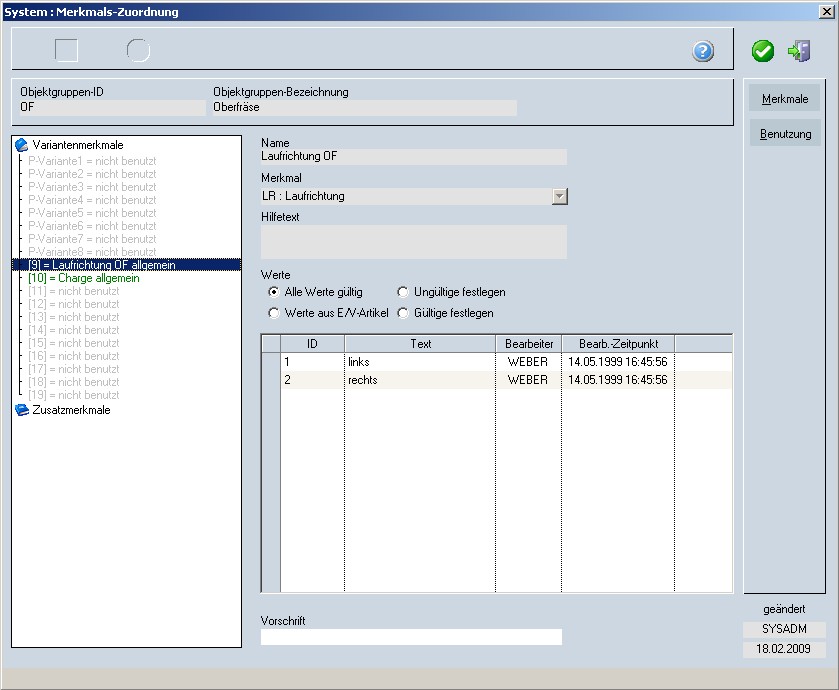 Über die Schaltfläche "Varianten" wird in den Dialog "Merkmals-Zuordnung" gewechselt. Hier können für diese Objektgruppe gültige zusätzliche Merkmale definiert werden (Verfahrensweise siehe Merkmalsdefinition).