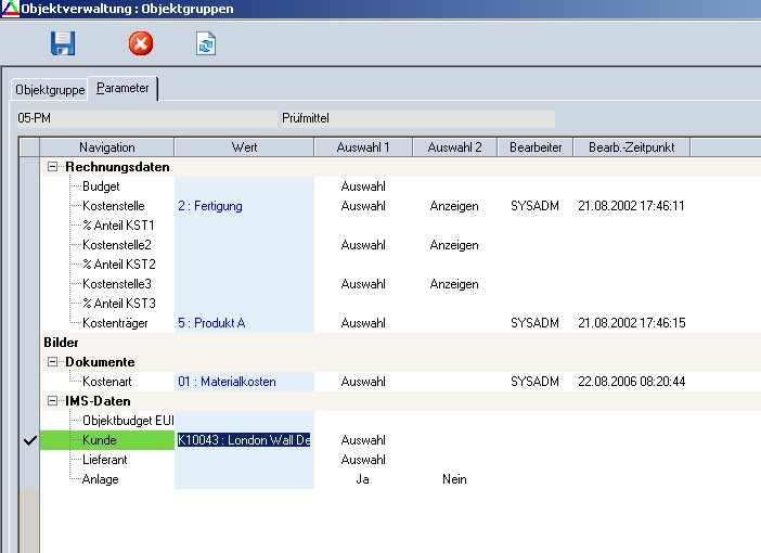 Die in der Objektgruppe festgelegten Parameter werden bei Zuordnung eines Objektes zu dieser Objektgruppe an das Objekt weitergegeben ("vererbt“) und müssen nicht einzeln erfasst werden, können aber objektspezifisch überschrieben werden. Die Erfassung, die Zuordnung und auch das Löschen erfolgt analog der Parameter bei Firmengruppen.