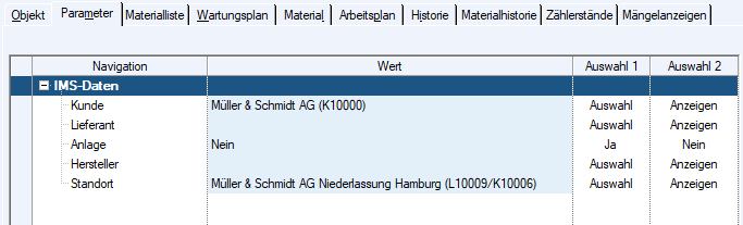 Hinterlegen von ParametereinstellungenAuf der Registerkarte "Parameter" werden alle Objektparameter angezeigt und können eingestellt sowie geändert werden. Die Einstellungen können speziell für das ausgewählte Objekt hinterlegt werden. Die Parameter unter "IMS-Daten" können aber auch von der Objektgruppe geerbt werden. Die geerbten Werte sind in blauer Schriftfarbe dargestellt und können bei Bedarf für das ausgewählte Objekt geändert werden.