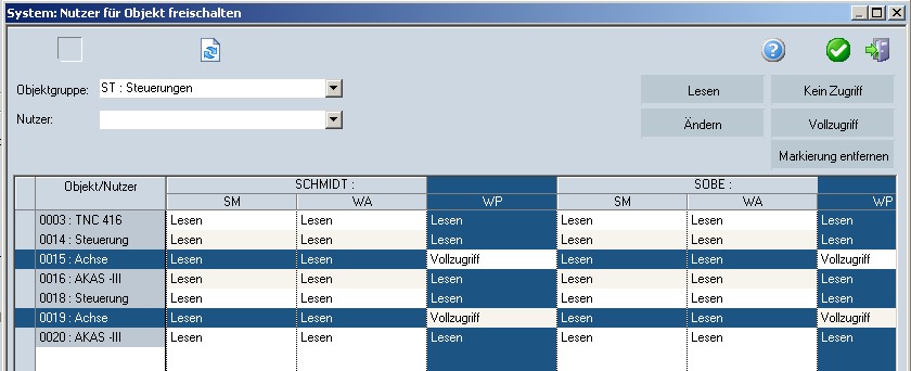 Hier können die Zugriffsrechte je Nutzer und Vorgangsart (SM: Störungsmeldung, WA: Wartungsauftrag, WP: Wartungsplan) für ein Objekt festgelegt werden. Dabei kann festgelegt werden, ob er keinen Zugriff (kein Recht) hat, lesen oder ändern (Schreiben) darf oder Vollzugriff (Löschen) hat. Es kann nach der Objektgruppe eingeschränkt werden.