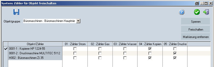 Die Option kann mittels Mausklick einzeln gesetzt/entfernt oder zeilen- und spaltenweise gesetzt/entfernt werden, indem zuerst die enstprechende Zeile/Spalte markiert und dann die Schaltfläche "Sperren" bzw. "Freischalten" betätigt wird. Beim Markieren ist die Mehrfachauswahl von Zeilen/Spalten möglich.