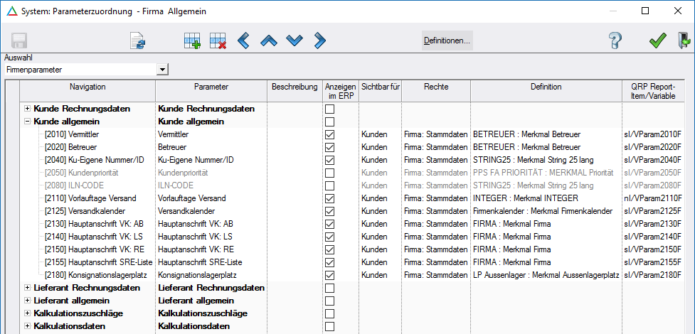 Entsprechend der Arbeitsweise sind nicht alle Parameter notwendig. Nicht benötigte Parameter können an dieser Stelle ausgeblendet werden, indem das Optionsfeld "Anzeigen im ERP" deaktiviert wird.