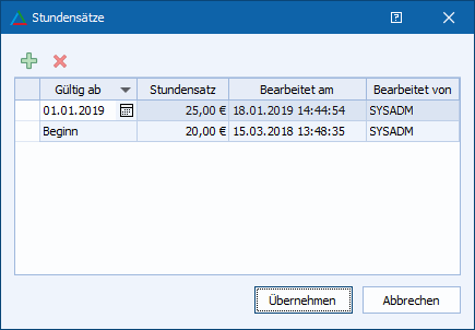Neben dem Stundensatz befindet sich das Symbol "Bearbeiten", mit dessen Hilfe der Dialog zum Verwalten der Stundensätze aufgerufen wird. Ein neuer Stundensatz wird unter Verwendung der Schaltfläche "Position neu anlegen" erstellt. Es können das Gültigkeitsdatum und die Höhe des Stundensatzes (in €) definiert werden. Hinweis: Die Gültigkeitszeiträume dürfen sich nicht überschneiden. Wenn kein Gültigkeitsdatum angegeben wird, wird automatisch "Beginn" angezeigt.