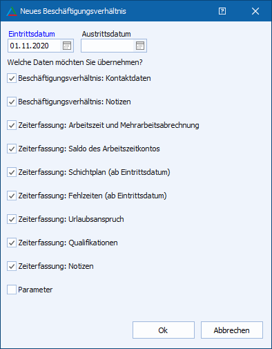 Daten eines bestehenden Beschäftigungsverhältnisses in ein neues übernehmenÜber die Schaltfläche "Neu" Auswahl "Beschäftigungsverhältnis (mit Datenübernahme)" können Daten von einem bestehenden in ein neues Beschäftigungsverhältnis übernommen werden. Im Dialog "Neues Beschäftigungsverhältnis" kann ausgewählt werden, welche Daten konkret übertragen werden sollen.