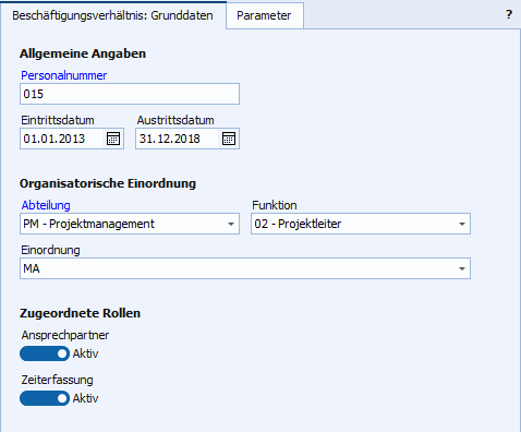 Über das Beschäftigungsverhältnis eines Mitarbeiters wird dessen organisatorische Einordnung in der eigenen Firma abgebildet. Weiterhin werden innerhalb von Beschäftigungsverhältnissen dem Mitarbeiter die Rollen "Ansprechpartner" und "Zeiterfassung" zugewiesen.