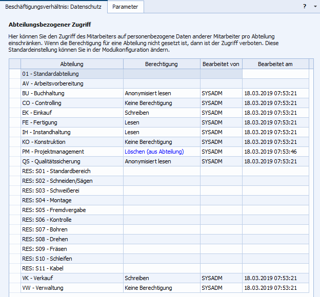 Abteilungsbezogener ZugriffDer Zugriff auf die personenbezogenen Daten anderer Mitarbeiter wird in der Tabelle verwaltet. Dieser wird beispielsweise in den Auswertungen zur Zeiterfassung berücksichtigt. Für jede Abteilung kann jeweils eine Berechtigung in der gleichnamigen Spalte ausgewählt werden.