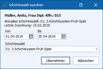 Im Dialog "Schichtmodell zuordnen" wird einem Mitarbeiter ein Schichtmodell zugeordnet.