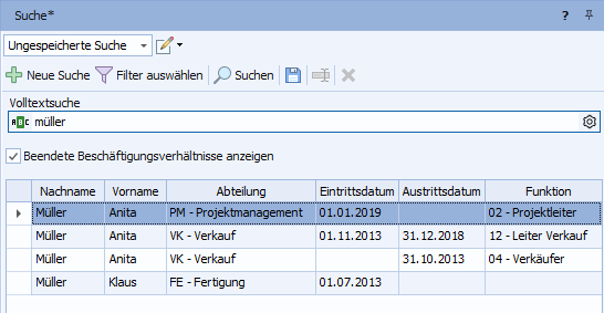 Mitarbeiter können entweder über die Schnellsuche im Menüband oder das Fenster "Suche" gesucht werden. Prinzipiell wird bei der Suche nach Mitarbeitern nach aktuell gültigen sowie eventuell bereits vorhandenen zukünftigen Beschäftigungsverhältnissen von Mitarbeitern gesucht. Beendete Beschäftigungsverhältnisse von Mitarbeitern werden standardmäßig nicht in der Suchergebnistabelle angezeigt, können aber über den Filter "Beendete Beschäftigungsverhältnisse anzeigen" in die Suche einbezogen werden.