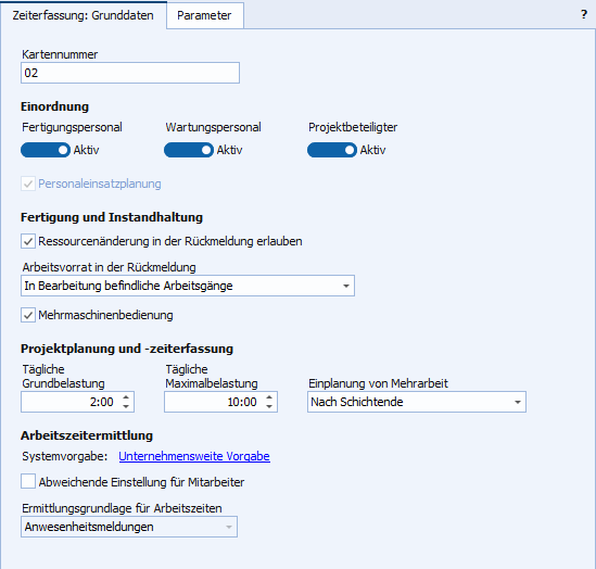 Ist für den Mitarbeiter die Einordnung "Fertigungspersonal" oder "Wartungspersonal" aktiv, können zusätzlich folgende Einstellungen vorgenommen werden: