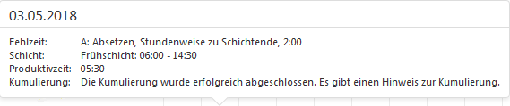Der Tooltip wird eingeblendet, wenn der Mauszeiger auf einer Tabellenzelle positioniert wird. Er enthält neben dem Datum Informationen bzgl. Fehlzeiten, Schicht, gesamter Produktivzeit und Kumulierung des entsprechenden Mitarbeiters.