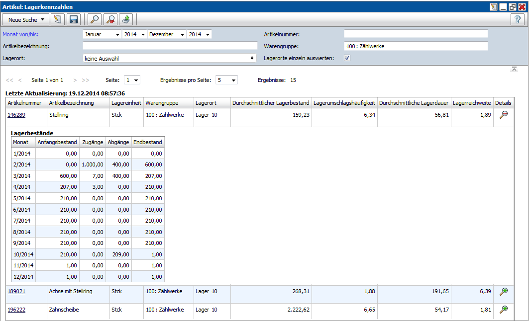 Die Lagerkennzahlen werden pro Artikel und Lagerort angezeigt.