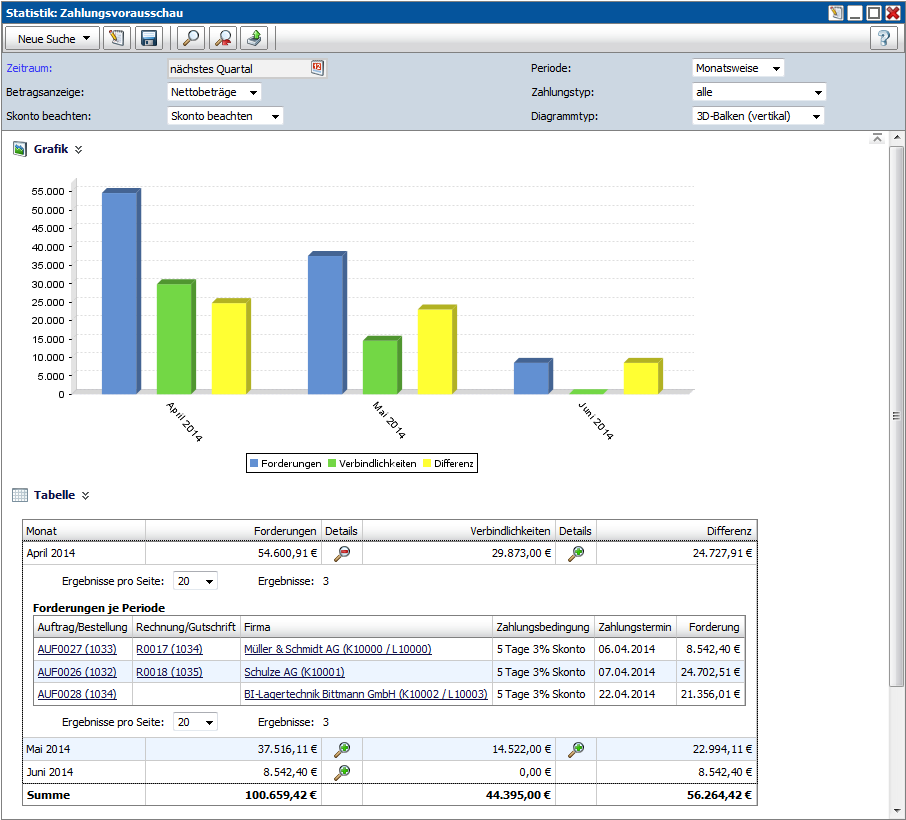 Das Portlet "Statistik: Zahlungsvorausschau" stellt für einen beliebigen Zeitraum wochen- oder monatsweise Forderungen und Verbindlichkeiten gegenüber und zeigt die Differenz aus beidem an.