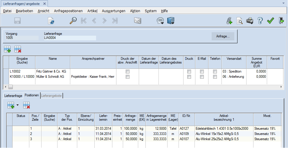 Wird ein Artikel neu in eine Lieferanfrage eingefügt, so ist die Preiseinheit in diesem Prozessschritt nicht editierbar.