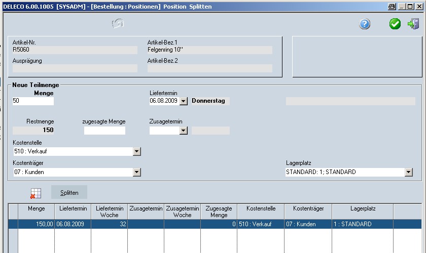 Nach der Eingabe der benötigten Daten muss mit der Schaltfläche Splitten die Position in die Tabelle eingefügt werden. Die Menge der Ausgangsposition wird reduziert. Sind alle Termine erfasst, wird der Dialog mit OK geschlossen. Es werden alle Positionen in die Bestellung eingefügt.