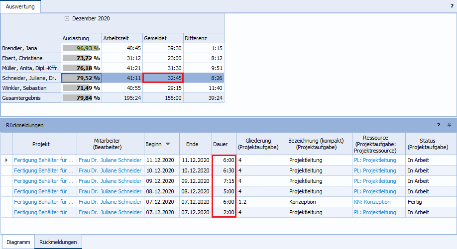 Abb.: Auswertung "Mitarbeiterauslastung - Gemeldet"