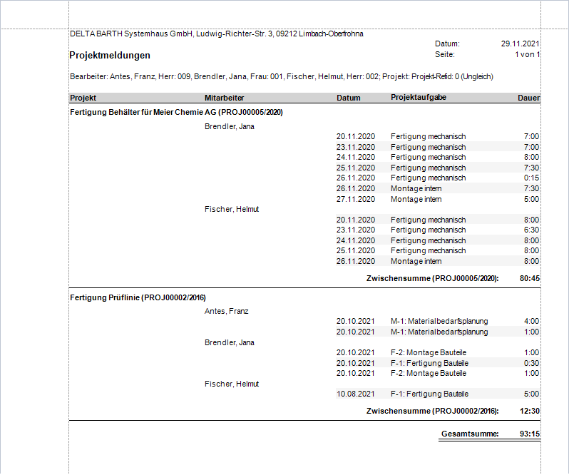 Abb.: Auswertung "Projektmeldungen" im Ausgabeformat "Bericht"