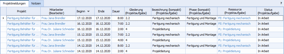 Die Tabelle "Projektmeldungen" listet alle Meldungen zu Projektaufgaben in einer Tabelle auf.