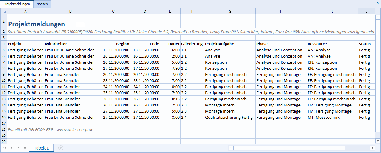Abb.: Auswertung "Projektmeldungen" im Ausgabeformat "Tabellenkalkulation"