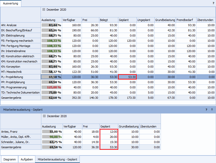 Die auf den Projektressourcen geplanten Projektaufgaben können zum einen zusätzlich in der Detailauswertung "Aufgaben" eingesehen werden. Zum anderen kann in der Detailauswertung "Mitarbeiterauslastung - Geplant" die geplante Auslastung der Mitarbeiter angezeigt werden, welche für die jeweiligen Ressourcen qualifiziert und verfügbar sind. Hinweis: Die Daten in den Detailauswertungen werden nur für den in der Pivottabelle markierten Bereich angezeigt.