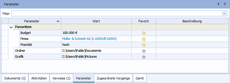 Abb.: Registerkarte "Parameter" - Beispiele für Projektparameter