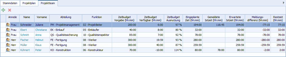 •In der Tabelle werden für alle dem Projektteam zugeteilten Mitarbeiter konzentrierte Informationen bereitgestellt. Diese geben auf einen Blick z.B. Auskunft über die eingeplanten, rückgemeldeten und erwarteten Zeiten.