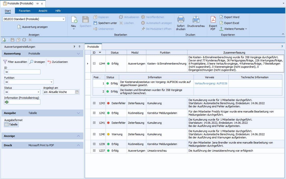 Das Modul "Protokolle" dient zur Anzeige von Protokollen, die von bestimmten DELECO Funktionen zur Dokumentation erstellt werden. Die Protokolle werden als Auswertung dargestellt.