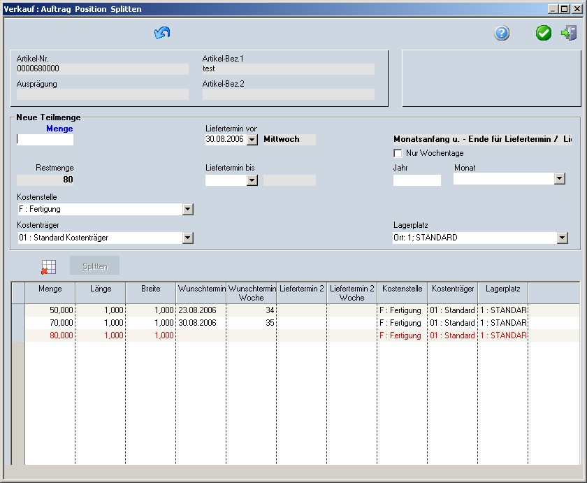 Nach dem Ausfüllen der Eingabefelder muss "Splitten" gedrückt werden. Es wird eine neue Position mit den eingetragenen Werten in die Tabelle übernommen. Auf diese Art und Weise können mehrere Positionen in der Tabelle erfasst werden. Mit "Ok" werden die Positionen in den Auftrag übernommen. Mit "Abbrechen" werden die gesplitteten Positionen verworfen.