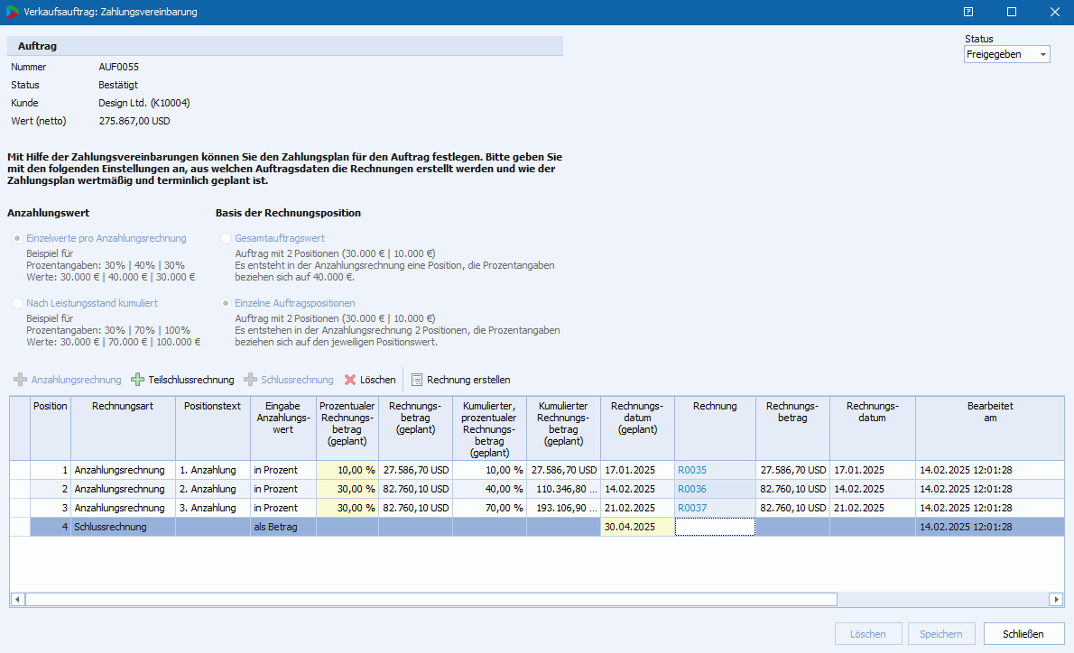 Eine zum Auftrag gehörige Abschlagsrechnung erscheint automatisch in der Zahlungsvereinbarung, sobald der zugehörige Auftrag bestätigt wurde. Die Schlussrechnung in einer Zahlungsvereinbarung wird immer wertmäßig angelegt.