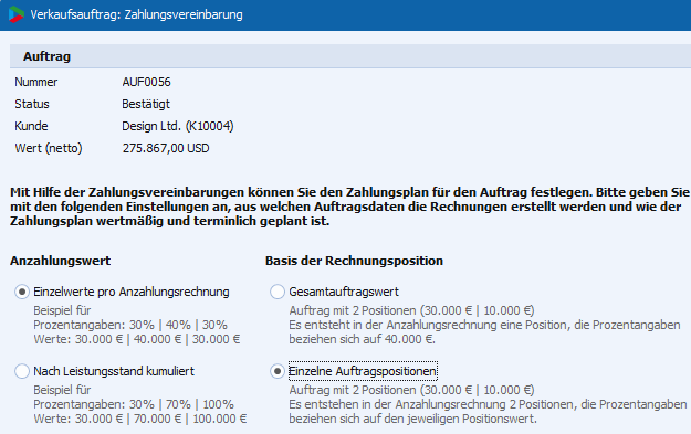 2. Wie soll der Rechnungswert ermittelt werden? a) zusammengefasst in einem Betrag, z.B. 30% des Auftragswertes werden abgerechnet, die Abrechnung enthält nur einen kumulierten Wert oder b) einzeln, pro Auftragsposition, d.h. jede Position im Auftrag taucht in der Abschlagsrechnung wieder auf