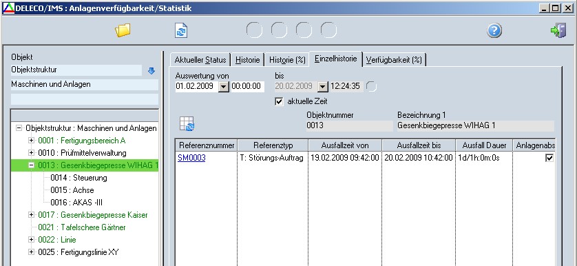 In der Registerkarte "Einzelhistorie" wird die Historie einer oder mehrerer Anlagen im ausgewählten Zeitraum angezeigt.
