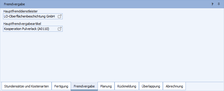 Auf der Registerkarte "Fremdvergabe" werden die einer Fremdvergaberessource zugeordneten Hauptfremddienstleister und Hauptfremdvergabeartikel angezeigt.