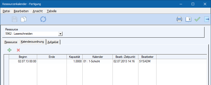 Abb.: Zuordnung eines Fertigungskalenders zur Ressource
