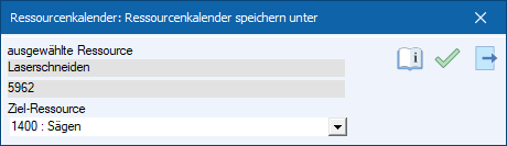 Kopieren von RessourcenkalenderzuordnungenMit Hilfe der Schaltfläche "Kopieren" können die Ressourcenkalenderzuordnungen der ausgewählten Ressource zu einer anderen Ressource kopiert werden. Dazu ist in dem sich öffnenden Dialog "Ressourcenkalender: Ressourcenkalender speichern unter" die gewünschte Zielressource auszuwählen.