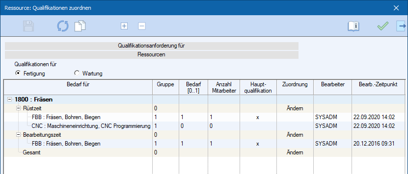 Über die Schaltfläche "Alle Ebenen öffnen" oder per Klick auf das "Plus"-Zeichen am Anfang der Tabellenzeile werden die bereits vorhandenen Zuordnungen angezeigt. Die Zuordnung von Qualifikationen erfolgt getrennt für die drei Zeitbereiche "Rüstzeit", "Bearbeitungszeit" und "Gesamt" (Fertigung) bzw. "Vorbereitungszeit", "Vorgabezeit" und "Gesamt" (Wartung).