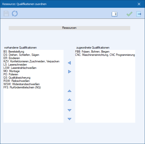 Auf der linken Seite werden die vorhandenen noch nicht zugeordneten Qualifikationen aufgelistet. Auf der rechten Seite werden die der Ressource / dem Arbeitsgang bereits zugeordneten Qualifikationen angezeigt. Durch Doppelklick auf die entsprechende Qualifikation oder durch Klick auf den entsprechenden Pfeil werden die markierten Qualifikationen zugeordnet bzw. wird die Zuordnung aufgehoben.