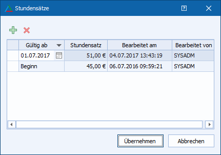Sollte sich ein Stundensatz ändern, kann ein neuer Eintrag in der Tabelle hinzugefügt werden. So ist es möglich, die Stundensätze in einer Historie zu speichern. Damit kann sichergestellt werden, dass bei der Kostensummierung die zum Zeitpunkt der Rückmeldung gültigen Werte zur Ermittlung der Fertigungskosten herangezogen werden.