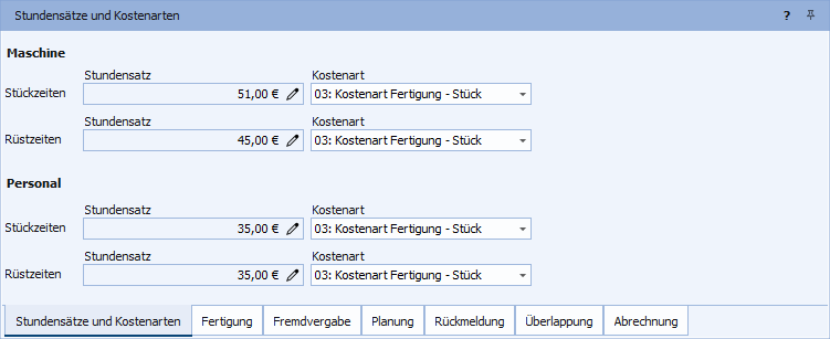 KostenartenFür den Maschinen- und Personaleinsatz können die entsprechenden Kostenarten unter Verwendung der Auswahlliste festgelegt werden. Für die anfallenden Stück- und Rüstzeiten kann dabei jeweils eine unterschiedliche Auswahl getroffen werden.