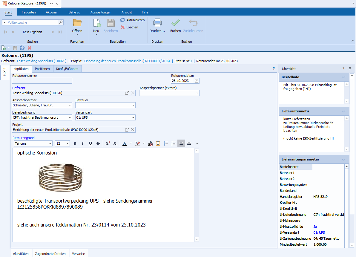 Der Titelbereich des Moduls beinhaltet die Felder Lieferant, Status, Projektzuordnung, Retourendatum der Ware.